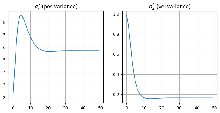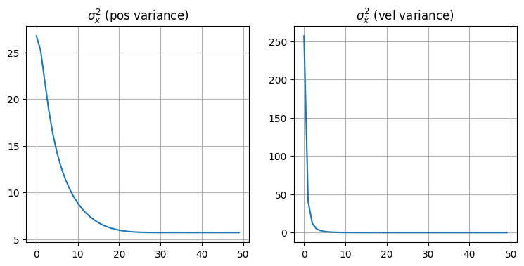 \(\mathbf{P}\) の対角要素は各状態変数の分散だから、適切な値を割り当てる必要がある。位置に対しては \(\mathbf{R}\) が適切な値であり、速度に対しては最大速度の二乗が適切な値となる。最大速度が二乗されるのは分散 \(\sigma^2\) に二乗が含まれるためだ。