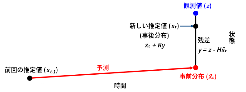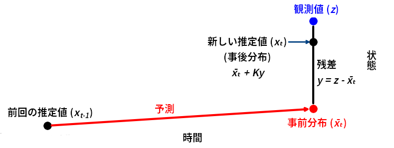 - \(\mathbf y\) と \(\mathbf K\) はそれぞれ残差とカルマンゲインである。