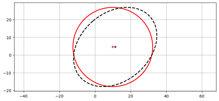 ax.set_aspect('equal')またはplt.axis('equal')を使っていることを必ず確認してほしい (後者ではxlimとylimを設定できる)。これを使わないと \(x\) 軸と \(y\) 軸が異なる比率になり、楕円が歪んで描画される可能性がある。例えば本当は横に長い楕円が縦に長く描画されるといったことが起きる。