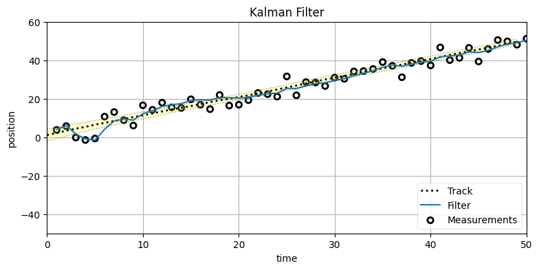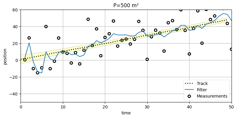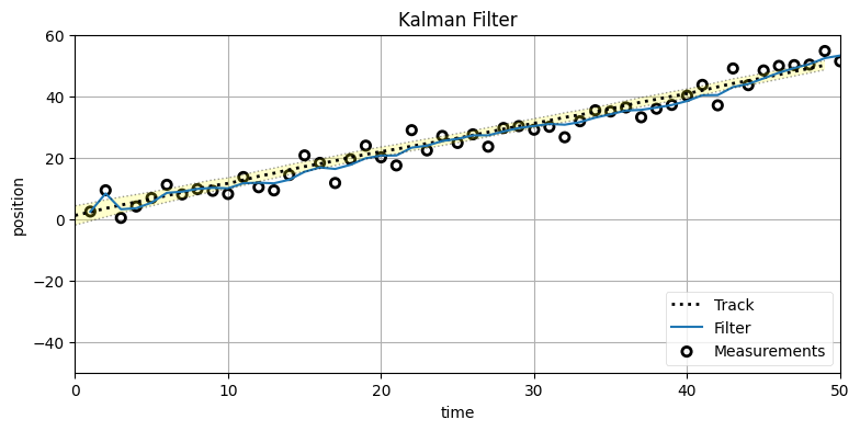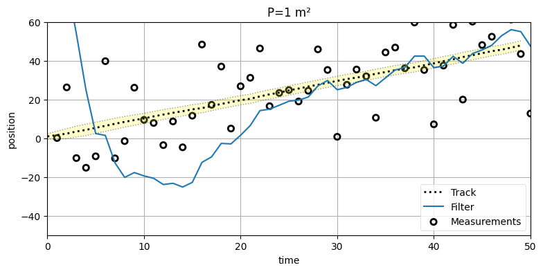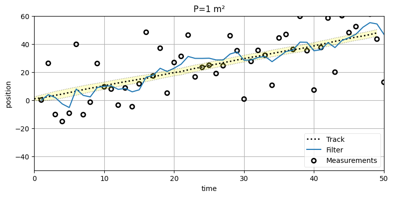 フィルタリングの進行とともに \(\mathbf{P}\) が変化するのが分かりやすいようパラメータを調整してある。本書を Jupyter Notebook またはウェブで読んでいる読者に向けて、フィルタが行うデータのフィルタリングを示すアニメーションを次に示す: