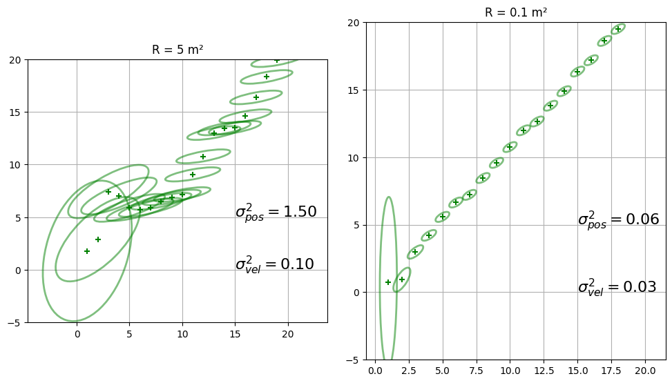訳注: ここでは \(R\) が大きいと相関が強くなる理由が説明されているが、強い相関が存在するとき共分散行列を表す楕円が必ず水平に近づくわけではない (むしろ、楕円は対角線方向に傾くので一般には水平から遠ざかる)。\(R = 5~\text{m}^2\) の場合に楕円が水平に近くなるのは、位置の分散が速度の分散より大きいことからの影響が大きい。コード中のコメントを外して相関係数を確認すると、\(R=5~\text{m}\) のときの方が (共分散楕円は水平に近いように見えるにもかかわらず) 相関係数が大きいことが確認できる。[return]