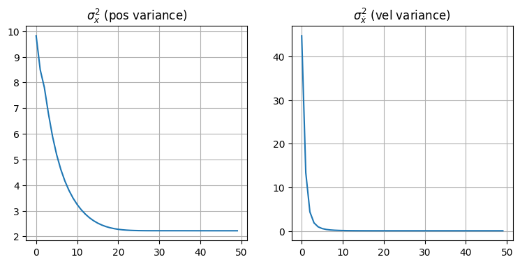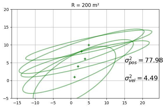 \(R = 5\,\text{m}^2\) とした最初のグラフでは最終的な楕円が縦よりも横に長くなっている。分かりにくかったら、グラフの横に最後の楕円における位置と速度の分散を示してある。