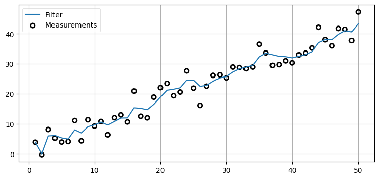 カルマンフィルタは再帰的なアルゴリズムとして設計されている──新しい観測値を受け取ると、すぐに新しい推定値が作成される。しかし事前に収集されたひとまとまりのデータに対してフィルタリングを行いたいという場合もよくある。カルマンフィルタは全ての観測値を一度に処理するバッチモードで実行することもでき、FilterPy では KalmanFilter.batch_filter 関数にバッチモードのカルマンフィルタが実装してある。この関数は観測値を順番にフィルタに入力して、出力される状態と共分散行列の推定値を配列に格納して返しているだけだ。batch_filter 関数があるとロジックが簡単になり、全ての出力を配列に楽に集められる。私はこの関数をよく使うのだが、読者には必ず実行される予測/更新サイクルによく慣れてほしかったので、紹介するのは章末まで待った。