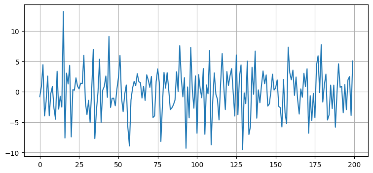 batch_filter 関数は省略可能なパラメータ引数 saver に filterpy.common.Saver オブジェクトを受け取る。これは状態と共分散行列以外の値を調べたいときに便利である。次に示すのは残差のプロットであり、ノイズが本当に \(0\) を中心としているかどうかを確認できる。これはフィルタの設計が上手く行っているかどうかを視覚的に確認するのに役立つ。もし残差が \(0\) を中心としていなかったり、そもそもノイズに見えなかったりしたら、フィルタの設計が上手くなかったり、プロセスがガウス分布で表せてない可能性がある。この話題には以降の章でも触れる。ここでは Saver クラスの利用例を示しておく: