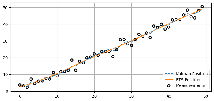 KalmanFilter は RTS スムーザー (RTS smoother) と呼ばれるこのアルゴリズムの一種を実装している。RTS という名前はアルゴリズムの開発者 Rauch, Tung, Striebel の頭文字である。batch_filter で計算した平均と共分散行列を rts_smoother に渡すと、平滑化された平均と共分散行列、そしてカルマンゲインが返る: