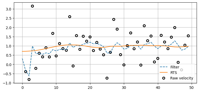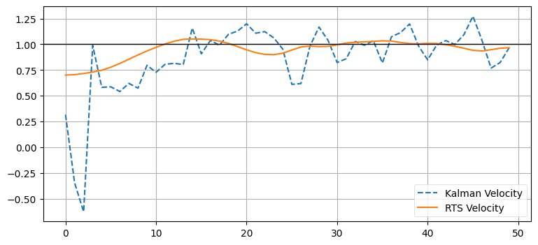ノイズが入力信号をダメにしており、生の値には事実上価値がないことが分かる。一方で RTS スムーザーの出力は非常に正確である。フィルタは速度に対して個別の推定値を管理する。カルマンゲイン \(\mathbf K\) は多次元であり、例えば \(\mathbf K = [0.1274, 0.843]^\mathsf T\) のような値を取る。このとき一つ目の \(0.1274\) は位置の残差をスケールするのに使われ、二つ目の \(0.843\) は速度の残差をスケールするのに使われる。位置と速度の相関は共分散行列を通してフィルタに伝わり、両方の状態に最適な形でフィルタリングが行われる。