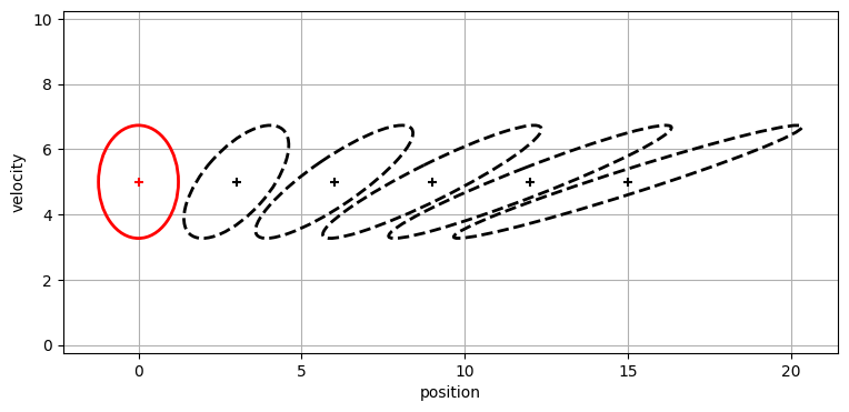 共分散行列 \(\mathbf{P}\) を解釈できるようになるまでグラフをよく観察しておくべきだ。\(9{\times}9\) の共分散行列などを目にしたときは圧倒されてしまうかもしれない──81 個もの数値を解釈する必要がある。そんなときでも、少しずつ考えれば難しくはない──対角要素には各状態変数の分散が含まれ、非対角要素には二つの状態変数の共分散が含まれる。\(9{\times}9\) の行列は画面にプロットできないから、この簡単な二次元の例で直感と理解を得ておく必要がある。