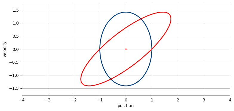 これが物理的に何を表すかを考えよう。楕円の \(x\) 軸方向の幅は位置の不確実性を表し、\(y\) 軸方向の幅は速度の不確実性を表す。そのため例えば \(x\) 軸方向より \(y\) 軸方向に長い楕円は位置より速度の方が不確実性が高いことを示す。逆に横に長い楕円は位置の不確実性が高く速度の不確実性が低いことを表す。最後に、傾きは位置と速度の相関の強さを表す。