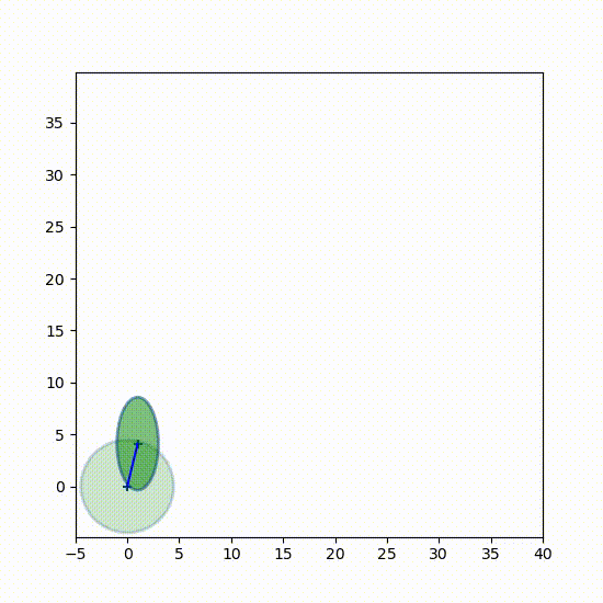 結果が期待通りであることを願う。楕円はすぐに横幅が広く、背が低くなる。これはカルマンフィルタが観測値ではなく予測値を使ってフィルタ結果を計算するためだ。また一行目をコメントアウトしてから二行目を実行すると、正しい軌道に乗るまでに時間がかかっているのも分かる。カルマンフィルタは観測値に非常に大きなノイズが存在すると思っているので、\(\dot x\) の推定値を更新するのが非常に遅い。