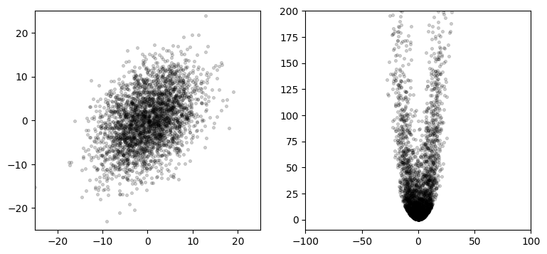左のグラフは次のガウス分布に独立に従う 3,000 個の点を示す: