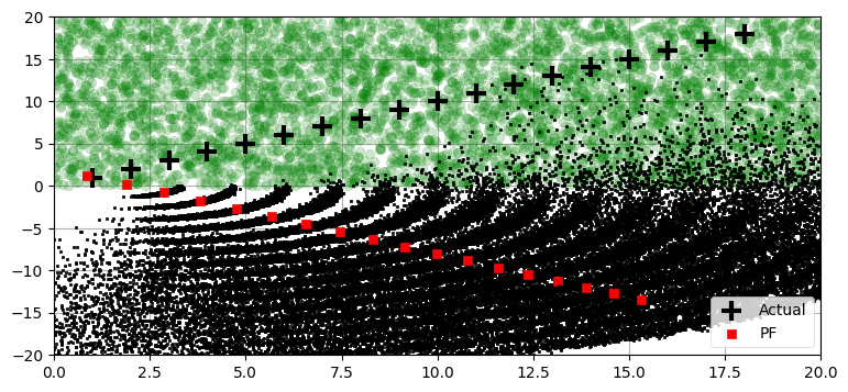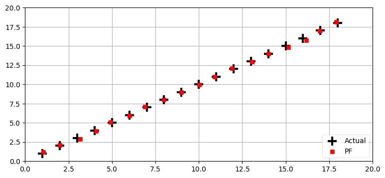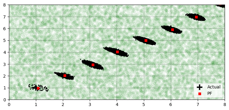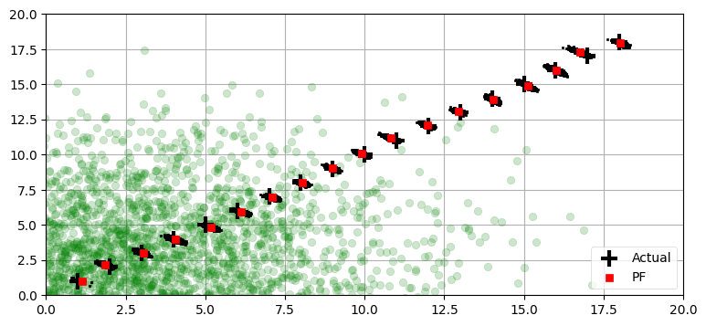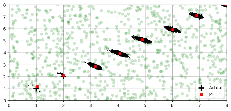 このナイーブなアルゴリズムには克服しなければならない実際的な困難があるものの、一般的なアイデアはこの通りである。一つ例を示そう。UKF と UKF の章で考えたロボットの自己位置推定問題を解く粒子フィルタの実行結果を次に示す。ロボットに対する旋回角と速度の制御入力は一定に設定して、ロボットから見えるランドマークへの距離を観測値とした。またセンサーと制御機構の両方にノイズがあり、ロボットの位置を追跡すると仮定してある。