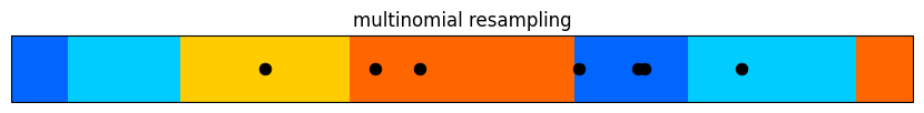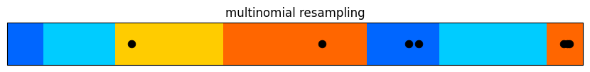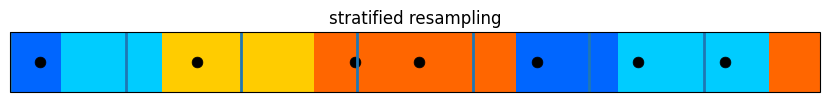 層化再サンプリングの例を次の図に示す。色付きのバーが重みの累積和を表し、灰色の縦線が \(N\) 個の小区間を区切る。黒い点で示される粒子は各小区間に一つずつランダムに配置されている: