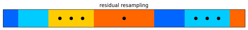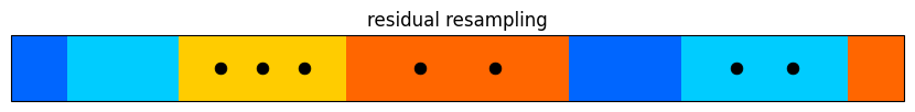 しかし、以上の処理はちょうど \(N\) 個のサンプルを選択するわけではない。サンプルを \(N\) 個にするために、スケールした重みの小数部分 (残差) に注目する。多項再サンプリングといったより単純なアルゴリズムを使って残差を重みとして残りの粒子を生成すれば、元の重みに従った全部で \(N\) 個の粒子が生成できる。一つ前の段落で示した例ではスケールした重みが \(3.6\) だったから、残差は \(3.6 - \lfloor 3.6 \rfloor = 0.6\) となる。この残差はそれなりに大きいから、この粒子はもう一度選択される可能性が高い。残差が大きい粒子は整数を使った一度目のサンプリングで本来より少ない回数しか選択されないので、これは理にかなっている。