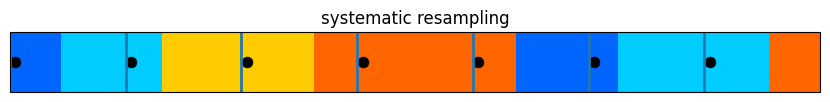 最後に等間隔再サンプリング (systematic resampling) を紹介する。このアルゴリズムは \([0,1]\) を \(N\) 等分する点は層化再サンプリングと同様だが、それから全ての小区間で利用するランダムなオフセットを一度だけ計算する。このため全ての点はちょうど \(\frac{1}{N}\) だけ離れる。等間隔再サンプリングの例を次の図に示す: