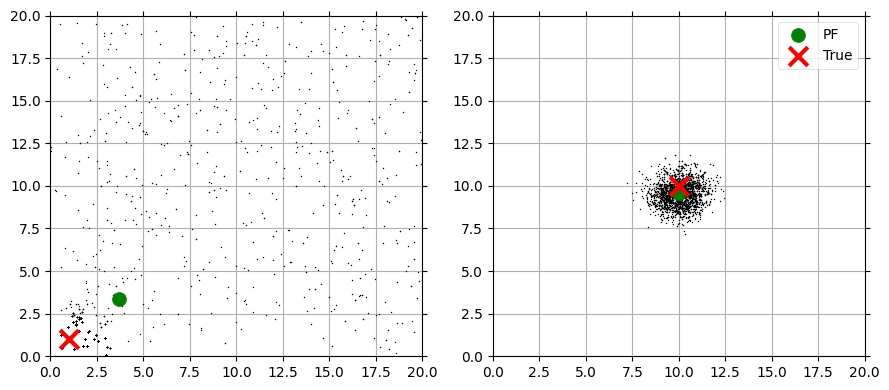 粒子フィルタを繰り返し実行したときの粒子の位置を次のグラフにプロットした。左のグラフは一反復後の位置を示し、右のグラフは十反復後の位置を示す。赤い X がロボットの実際の位置を、緑色の大きな円が重み付き平均として計算されたロボットの位置の推定値を表す: