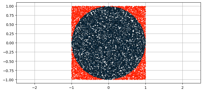 点が円の中に入るのは、その点から円の中心までの距離が半径以下のときである。距離の計算にはベクトルの長さを求める numpy.linalg.norm を利用する。今考えている円の中心は \((0,0)\) だから、この関数で円の中心からの距離が計算できる: