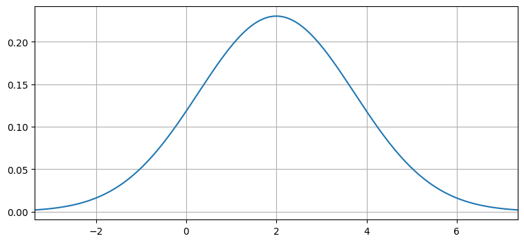 確率分布の確率密度関数 (PDF) があると、その確率分布に従うランダムな値が特定の二つの値の間に収まる確率を積分で計算できる。例えば上のガウス分布に従うランダムな値 \(x\) が \(0\) から \(2\) の間の値となる確率を知りたいとしよう。上に示したのは連続確率分布の確率密度関数だから、考えている範囲の曲線と \(x\) 軸が囲む部分の領域の面積がその確率に等しい。一般的に言えば次の通りである: