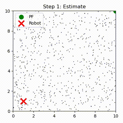 最初の反復が終わった段階では粒子はまだ全体にわたってほぼランダムに散らばっている。ただロボットの位置の近くに集まっている粒子があるのも分かる。これは観測値にどれだけ近いかに応じて全ての粒子が重み付けされるためである。ロボットは \((1,1)\) の近くにいるので、\((1,1)\) の近くにある粒子には観測値に近いということで大きな重みが割り当てられ、生き残る可能性が高くなる。ロボットから遠い粒子は観測値から遠いので、そういった粒子の重みは低くなる。位置の推定値は粒子の位置の重み付き平均として計算される。その計算ではロボットに近い粒子からの寄与が大きいので、推定値は最初の反復でも正確になる。