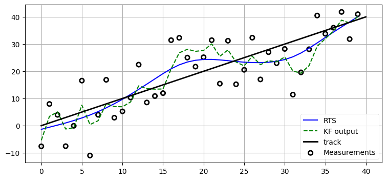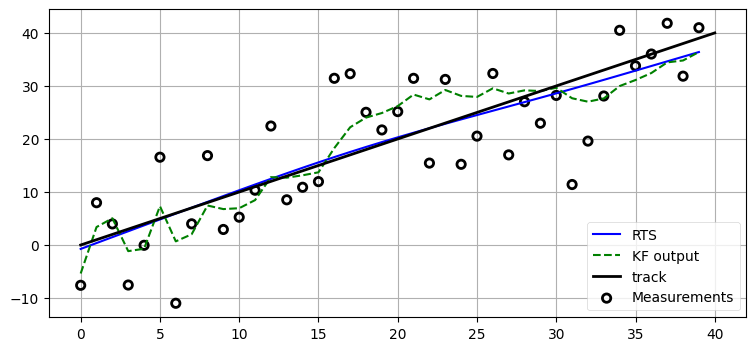 RTS スムーザーの出力と理想的な出力の見分けが付くように大きなノイズを加えている。このグラフを見ると、緑色の破線が示すカルマンフィルタの出力は入力と比べれば滑らかであるものの、いくつかの観測値が連続して実際の値の上または下に偏ると理想的な直線から離れることが分かる。これに対して RTS スムーザーの出力は非常に滑らかであり、さらに理想的な出力に非常に近い。