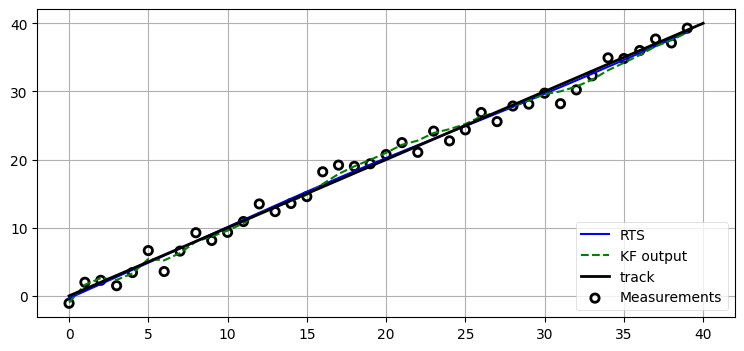 ノイズをもっと現実的な値にすれば、RTS スムーザーの出力は理想的な直線とほぼ一致するだろう。そのときでもカルマンフィルタの出力は (ノイズが小さくなるので正確にはなるものの) 理想的な直線からは離れるはずだ: