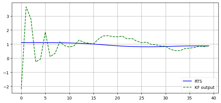 このグラフから、RTS スムーザーが行う「平滑化」は普通の意味での平滑化ではないことが分かる。RTS スムーザーはこちらが伝えた系の振る舞いおよび系と観測値のノイズ、そして過去と未来の観測値を使って最適な推定値を計算する。
