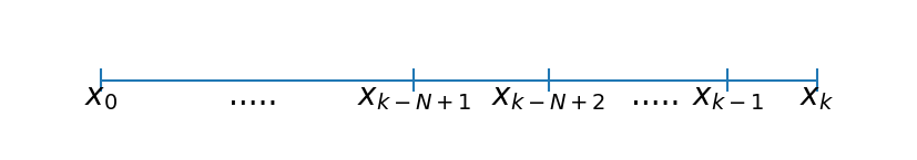 普通のカルマンフィルタを使うと時刻 \(k\) で \(x_k\) の推定値を計算できる。しかし時刻 \(k\) で受け取った観測値を使えば、\(x_{k-1}\) の推定値を改善できる。同様に時刻 \(k-1\) と \(k\) の観測値を使えば \(x_{k-2}\) の観測値を改善でき、この考え方は \(N\) 個前の時刻まで繰り返すことができる。