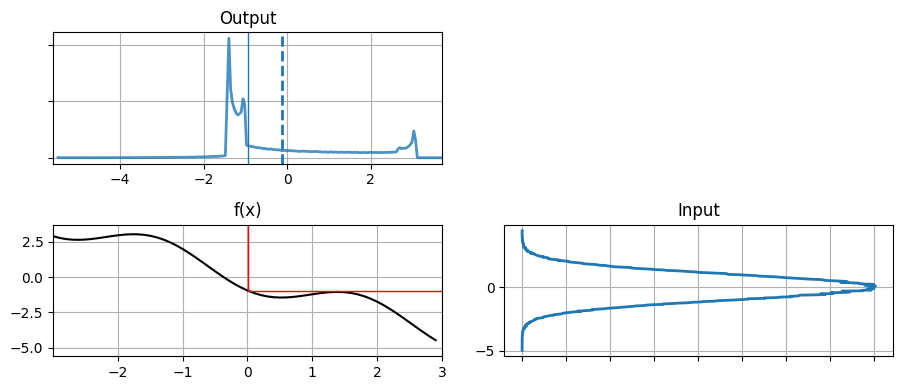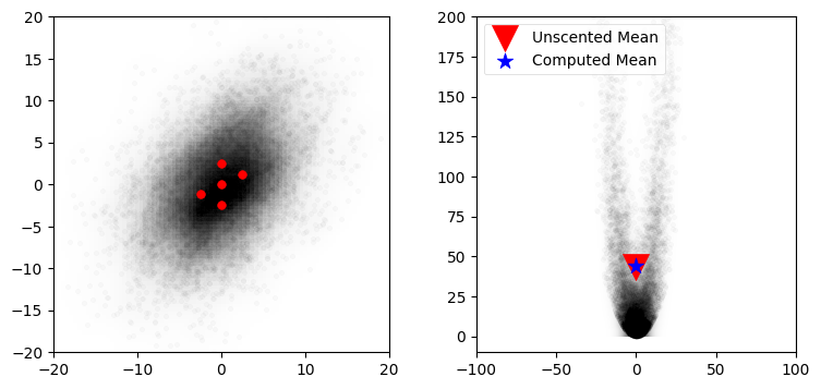 ここでは 500,000 個のサンプルを入力の分布から生成し、非線形な変換を適用し、その結果からヒストグラムを構築している。このとき使う点をシグマ点 (sigma point) と呼ぶ。出力のヒストグラムからは平均と標準偏差を計算でき、そこからは更新後の (出力の分布を近似する) ガウス分布が得られる。