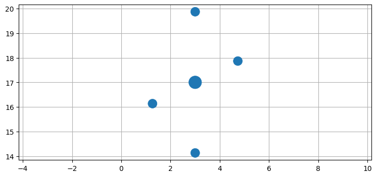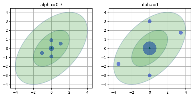 具体的な処理は後で明らかになる。オブジェクト sigmas は平均と共分散行列を受け取って重み付きシグマ点を生成する。試しに使って見よう。次のプロットでは点の大きさが重みを表す: