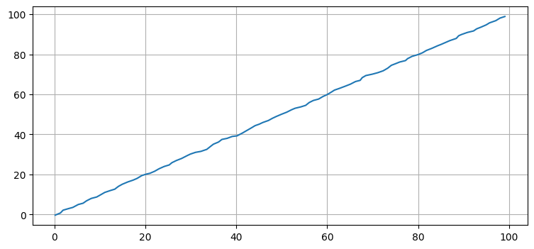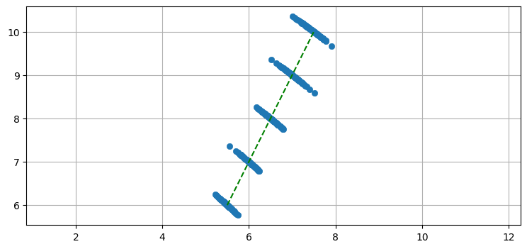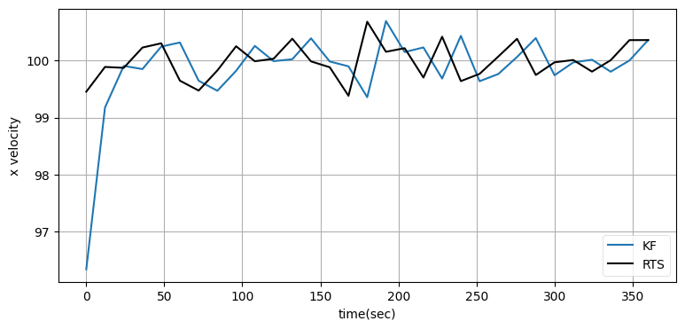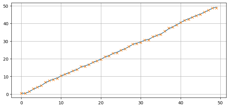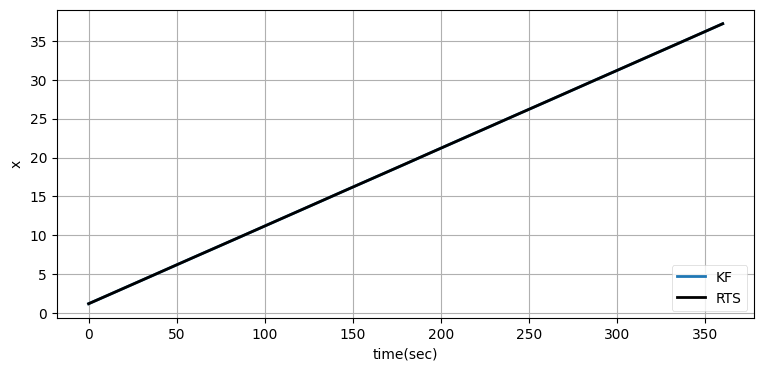 はっきり言っておくと、これは線形な問題である。本当は UKF を使う必要はないのだが、最も簡単な問題から説明を始めている。\(\mathbf{\bar x}\) の計算が行列乗算ではなく関数 fx における式の計算で行われることに注意してほしい。こう書いたのは任意の非線形関数を実装できることを示すためだ。この計算は線形な式に制限されない。