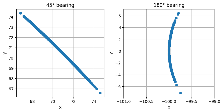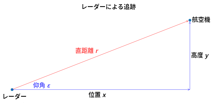 前章では非線形な系がもたらす難しさを議論した。この非線形性は二つの場所で現れる。一つは観測値である。例えばレーダーが直距離 (slant, 自身と目標を直線で結んだ距離) を観測するとき、\(x\) 座標を計算するには平方根を取らなければならない: