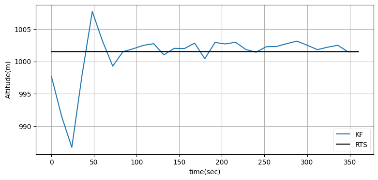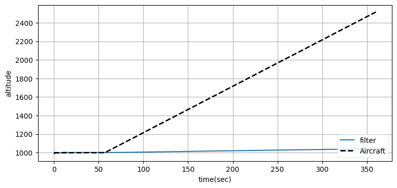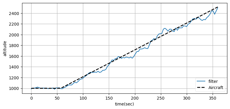 ではフィルタを実装してみよう。非線形フィルタに挑戦する準備はまだ整っていないので、これから標準的な一次元線形フィルタを実装する。フィルタの設計はこれまでと大きくは変わらないものの、一つ違う部分がある。KalmanFilter クラスは行列 \(\mathbf{F}\) を状態遷移関数として使っていた。線形代数の概念である行列は線形関数を表すには都合がいいのだが、非線形関数を表すことはできない。そこで上の実行例と同じように、行列の代わりに関数を渡すことになる。KalmanFilter クラスは観測関数を実装する行列 \(\mathbf{H}\) も持っていて、\(\mathbf{H}\) は状態を等価な観測値に変換していた。ここでも行列は線形性を意味するので、行列の代わりに関数を渡すことになる。\(\mathbf{F}\) と \(\mathbf{H}\) が「状態遷移関数」および「観測関数」と呼ばれる理由がこれで分かったはずだ: 線形カルマンフィルタでは \(\mathbf{F}\) と \(\mathbf{H}\) が行列だったが、これは関数がたまたま線形なときは行列を使った方が計算を簡単に行えるというだけである。