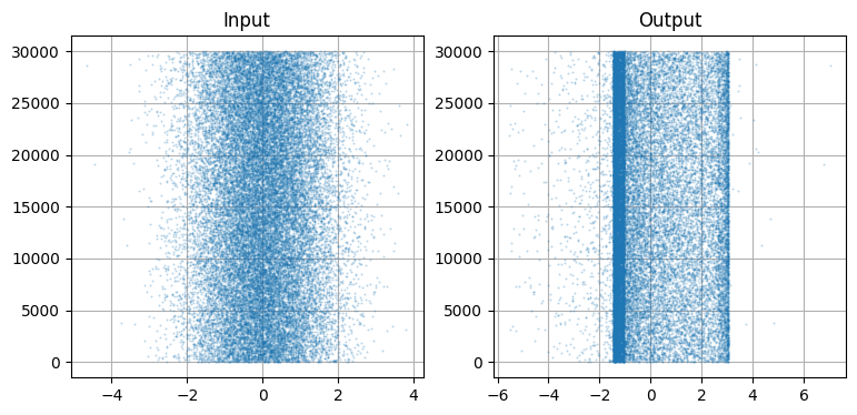 ガウス分布なので当然だが、左の散布図はガウス分布らしく見える。「ガウス分布らしい」とは平均 \(0\) を中心とした白色ノイズに見えるという意味である。これに対して f(data) の散布図には目に見える構造がある。垂直の帯が二つあり、その間に大量の点が存在する。帯の外側には点がほとんど存在せず、どちらかと言えば負の部分に点が多い。