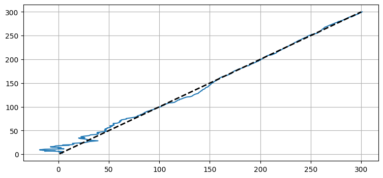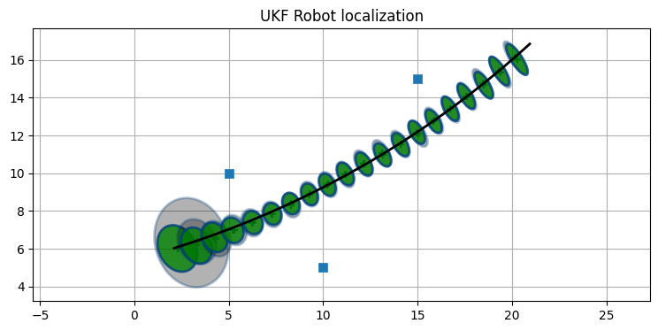 ここに本質的に新しい事項はない。シグマ点を自分で計算し、\(\mathbf{F}\) と \(\mathbf{H}\) による乗算を行列ではなく関数として実装しただけだ。これで UKF の理解に必要な少しばかりの数学とアルゴリズムを苦労して理解するのに十分な自信が付いたことを願う。