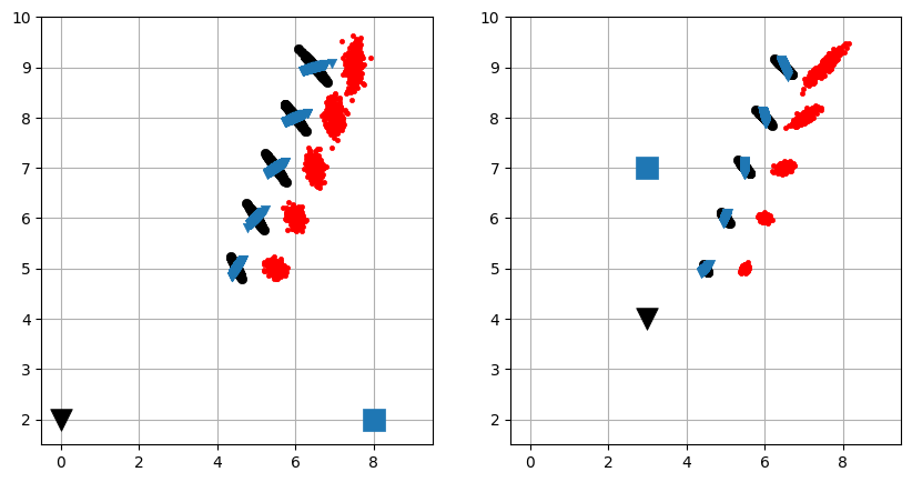 続いて f(x, dt) と h(x) に追加データを渡す必要がある。f(x, dt) では move(x, dt, u, wheelbase) を、h(x) では Hx(x, landmarks) を実行しなければならない。これを行うには、次のように predict と update にキーワード引数を渡す: