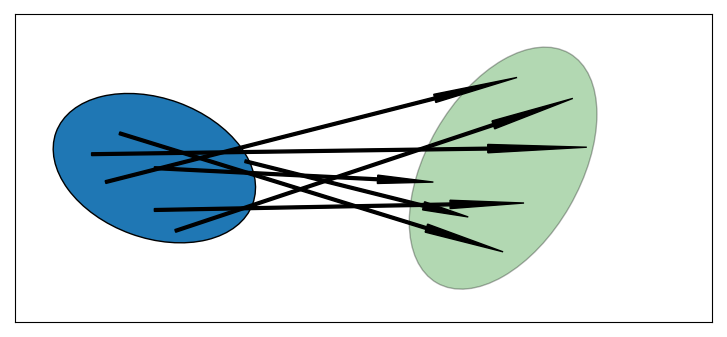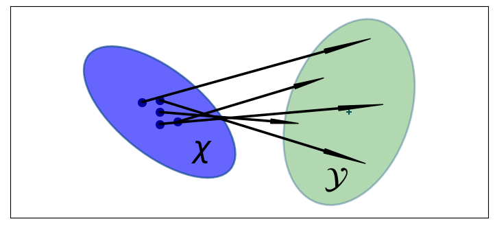非線形関数による確率分布の変換を二次元の共分散楕円を使って考えてみよう。二次元を使うのはプロットしやすいからであり、これからの議論は高次元にも拡張できる。任意の非線形関数を仮定する。変換したい分布の共分散楕円からランダムに点を取り、点を非線形関数に通し、計算される新しい位置をプロットする。変換された点の平均と共分散行列を計算すれば、それを変換後の確率分布の推定された平均と共分散行列として利用できる。これを次の図に示す: