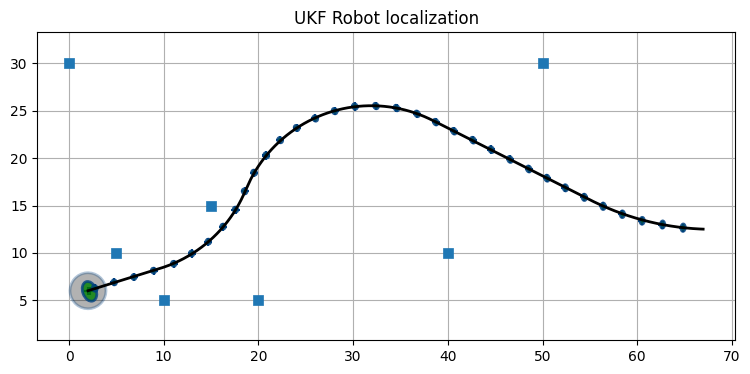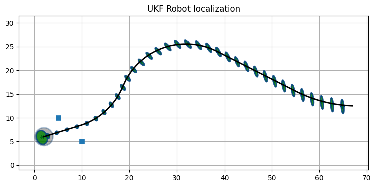 残りの部分はシミュレーションを実行して結果をプロットするコードである。landmark という変数を作成し、ここにランドマークの座標を格納している。またシミュレーションではロボットの位置を一秒に十回更新するのに対して、UKF は一秒に一度しか実行されない。これは運動を表す微分方程式の積分でルンゲ=クッタ法を使っていないためで、タイムステップを小さくしてシミュレーションを正確にしている: