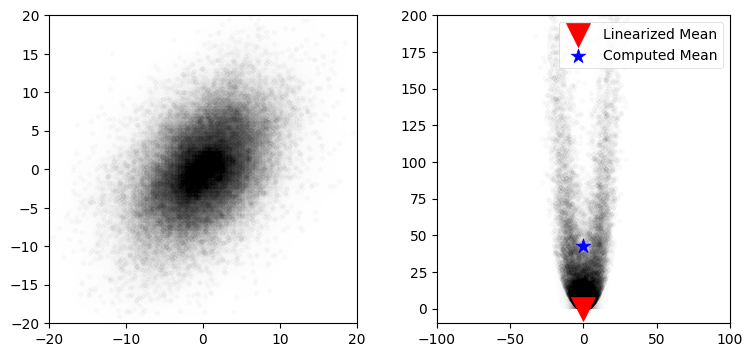 このプロットからは関数 f_nonlinear_xy が持つ強い非線形性が分かる。また拡張カルマンフィルタ (次章で学ぶ) と同じ方法で線形化したときに計算される平均 (赤い下三角) の誤差が大きいのも確認できる。