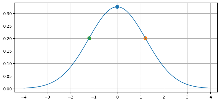 次に少ない点の個数はいくつだろうか? 二つだ。しかしガウス分布は対称であり、恒等関数に対して正しく動作するにはおそらくシグマ点の一つが入力分布の平均でなければならない。二つの点のうち一つを平均に配置すると、もう一つの点をどこに配置しても望ましくないであろう非対称性が生まれてしまう。シグマ点を二つ使うフィルタリングを恒等関数 \(f(x)=x\) に対して正しく動作させるには大きな手間がかかると思われる。