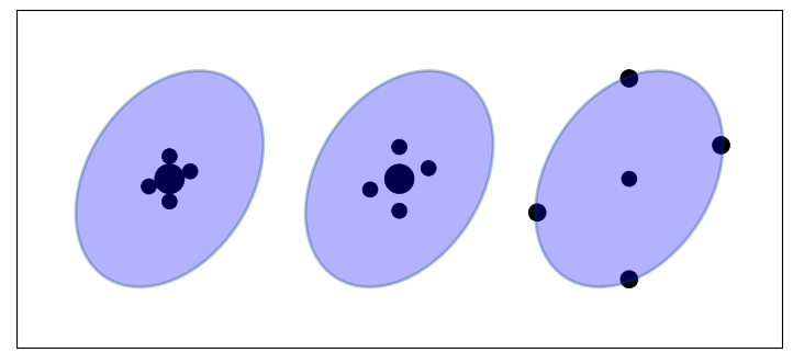 これらの制約を満たすアルゴリズムを私たちは探しており、次元ごとにシグマ点を三つだけ使うのが望ましい。話を次に進める前に、今考えていることの理解を確認しておこう。同じ共分散楕円に対するシグマ点の三つの異なる配置を次に示す。シグマ点の大きさは重みを表す: