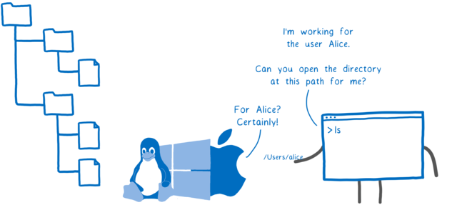 ユーザーがプログラムを起動すると、プログラムはそのユーザーの代理として実行されます。ユーザーがあるファイルへのアクセスを持つなら (つまりそのファイルの所有者であるか、アクセスを持つグループに属していれば)、起動されたプログラムもそのファイルに対して同じアクセスを持ちます。