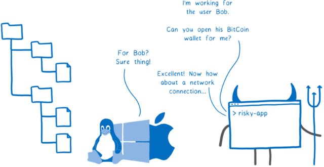例えば、あなたのアプリケーションが使っているライブラリのメンテナが新しくなったとします (オープンソースではよくあることです)。新しいメンテナは心からプロジェクトに貢献しようとしている人物かもしれません...しかしひょっとすると悪いヤツかも知れません。もしあなたがシステムで自由な処理を行う (例えばファイルを開いてネットワーク越しにどこかに送る) ためのアクセスを持っていたとすると、前述のアクセス制御を利用した場合、このコードはシステムに深刻なダメージを与えられます。