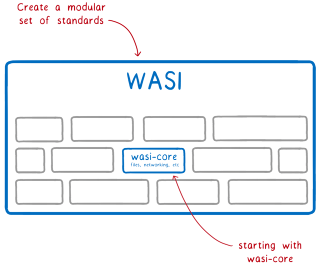 モジュールを使ったアプローチがここで役に立ちます。モジュール化しておくことで、広い部分を標準化しつつ、WASI の一部しか使わないニッチなプラットフォームも存在できるようになります。