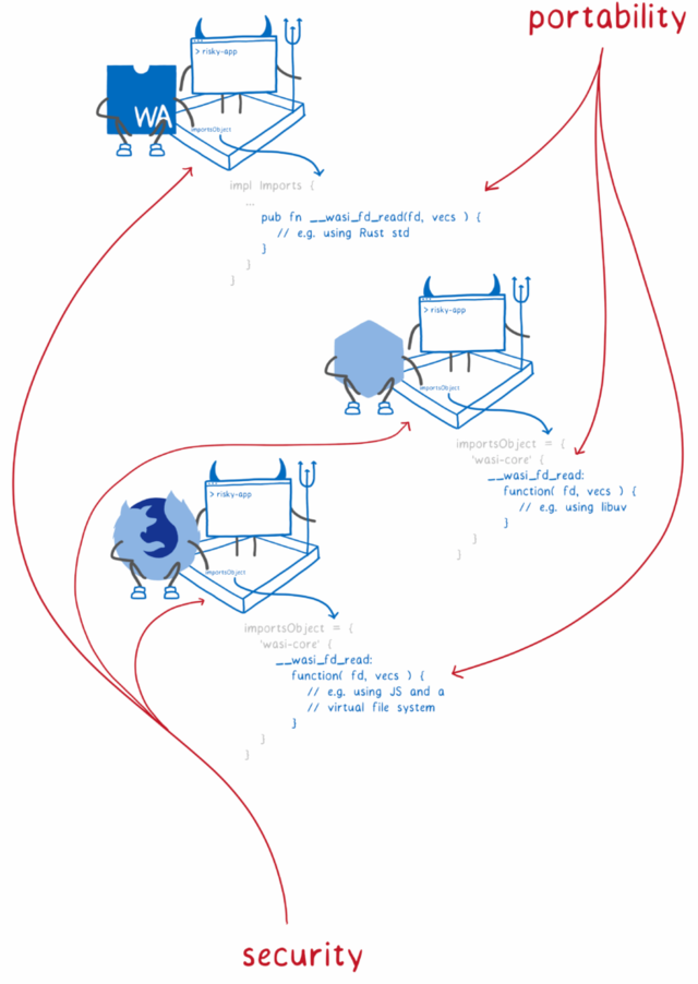 これによってプラットフォームごとに独自の wasi-core 実装を作れるようになり、ポータビリティが向上します。ここで言うプラットフォームとは、Mozilla の wasmtime や Fastly の Lucet などの WebAssembly ランタイム、Node、あるいはブラウザだって指します。