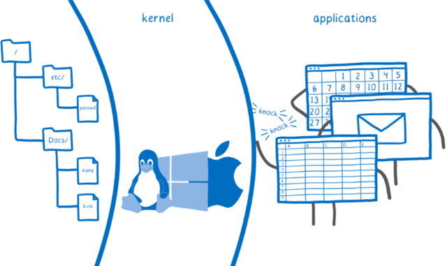 リングプロテクションがある場合、オペレーティングシステムは保有するリソース (のほとんど) に保護バリアを張ります。このバリアがカーネル (kernel) です。カーネルだけが新規ファイルの作成したり、ファイルを開いたり、ネットワーク接続を開いたりといった処理を行えます。