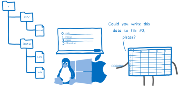 そのような言語を使ったとしても、ほとんどのシステムにおいてはファイルへ直接アクセスしてファイルを作ったり開いたりできるわけではありません。どうしてでしょう?