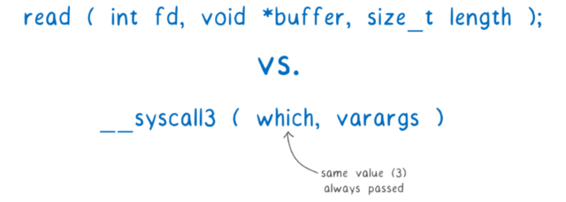 二つ目のパラメータ varargs がシステムコールに渡される引数です。これが varargs と呼ばれているのは、個数が可変 (VARiable) だからです。WebAssembly には関数に引数の数を伝える仕組みが存在しないので、これらの引数はメモリ上に一列に並んだ状態で渡されます。これは型安全で無いばかりか、引数をレジスタに入れて渡せる場合には実効速度が落ちます。