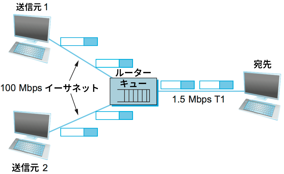 本書は待ち行列理論に関する本ではないので、M/M/1 待ち行列は詳しく説明しない。「1」はサーバーが一つだけ存在することを表し、二つの「M」はパケットの到着とサービスの時間がどちらもマルコフ性 (Markov property) を持つ、つまり指数的であることを表す。 ↩︎
