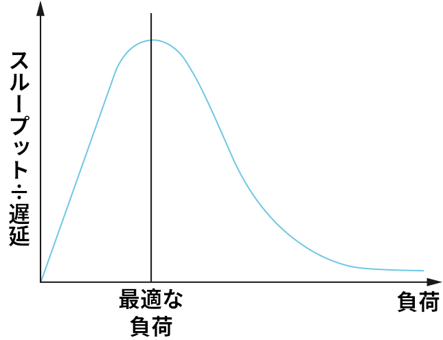 このパワーという比を最大化することが目標となる。パワーはネットワークにかける負荷の関数であり、この負荷はリソース割り当ての仕組みよって設定される。図 154 に負荷とパワーの関係を示す。リソース割り当ての仕組みはパワーが最大となる負荷をかけることが理想とされる。それより負荷が小さいときは、リソース割り当てが保守的すぎる: リンクを忙しくさせるのに十分なパケットがネットワークに送られていない。それより負荷が大きいときは、ネットワーク内に存在するパケットが多すぎるために、キューが長くなることによる遅延の増加がスループットの小さな改善を上回っている。