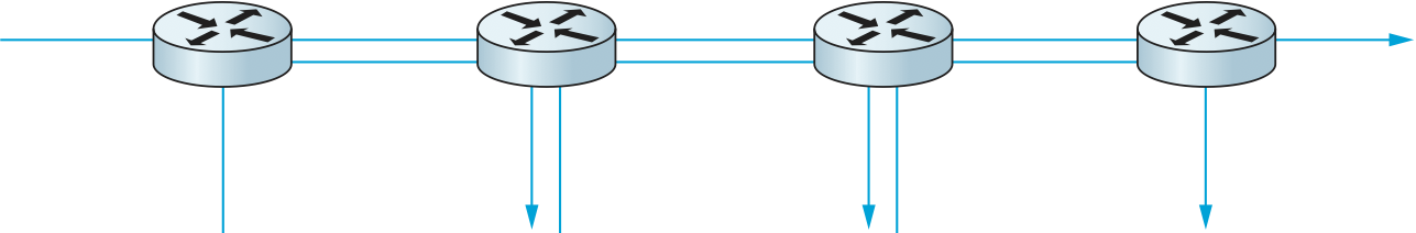 本章の前半では、インターネットと同じベストエフォート型サービスモデルを仮定する仕組みに注目する。ベストエフォート型サービスでは全てのパケットが事実上同一の扱いを受け、ホストがネットワークに向かって特定のパケットあるいはフローに対する何らかの保証や優遇を要求することはできない。何らかの保証や優遇サービスをサポートする ── 例えば、映像ストリームに必要な帯域を保証する ── サービスモデルは第 6.5 節の話題となる。そういったサービスモデルは複数の QoS (quality of service, クオリティオブサービス) を提供すると言う。これから見るように、完全にベストエフォート型のサービスモデルから個別のフローに QoS の質的保証が保証されるサービスモデルまでの間には可能なサービスモデルが数多く存在する。広いアプリケーションの要望に応えるサービスモデル、さらに将来に開発されるアプリケーションの要望に応えるサービスモデルを定義することは最も難しい課題の一つである。