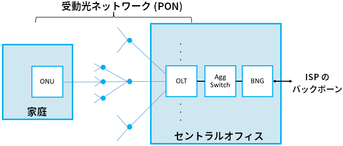もう少し文脈を提供しておくと、ISP (例えば通信事業者やケーブルテレビ事業者) は全国的なバックボーンを運用する場合が多い。そのバックボーンには数百あるいは数千のエッジ設備が接続され、それぞれが一つの都市などの一定の範囲にサービスを提供する。このエッジ設備は通信事業者ではセントラルオフィス (central office) と呼ばれ、ケーブルテレビ事業者ではヘッドエンド (head end) と呼ばれる。これらの名前は「中央」あるいは「一番上」を示唆するにもかかわらず、セントラルオフィスおよびヘッドエンドは ISP のネットワークの最も端に位置する: ISP から見たラストマイルであり、直に顧客と接続する。PON とセルラーネットワークのアクセスネットワークはこういった設備で利用される1。